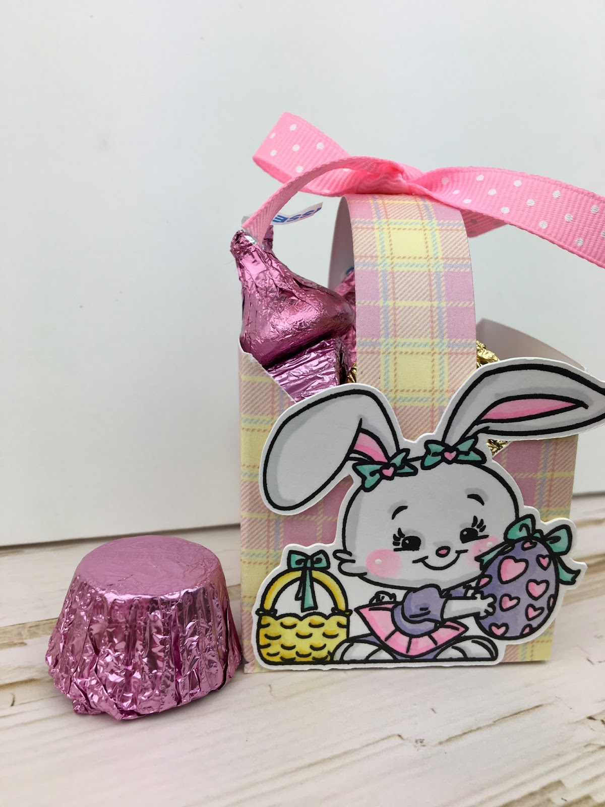 I added bows to the top of each basket with adhesive and filled them with Easter Hershey Kisses and Easter Reeses Peanut Butter Cups.