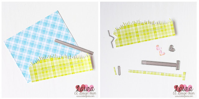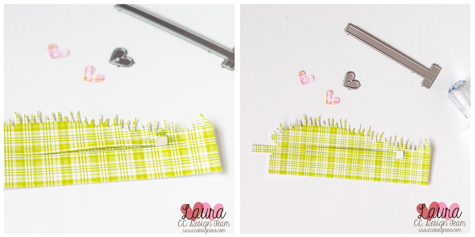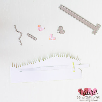 I started off by cutting an A2 rectangle and a grassy hillside out of some patterned paper. I used one of the dies in the C.C. Designs Pull Tab Cutter set to cut a slit in the grassy hillside (left picture).