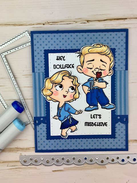 Step #5: Adhere your scallop frame with the white rectangle to the center of your cards and decide how you want to place your Roaring 20s Gals & Guys.