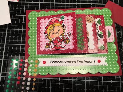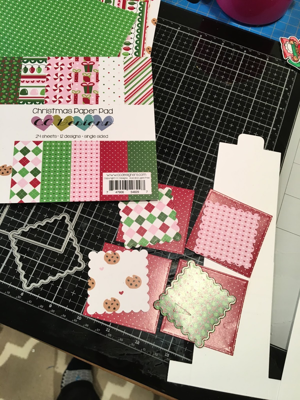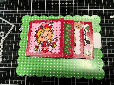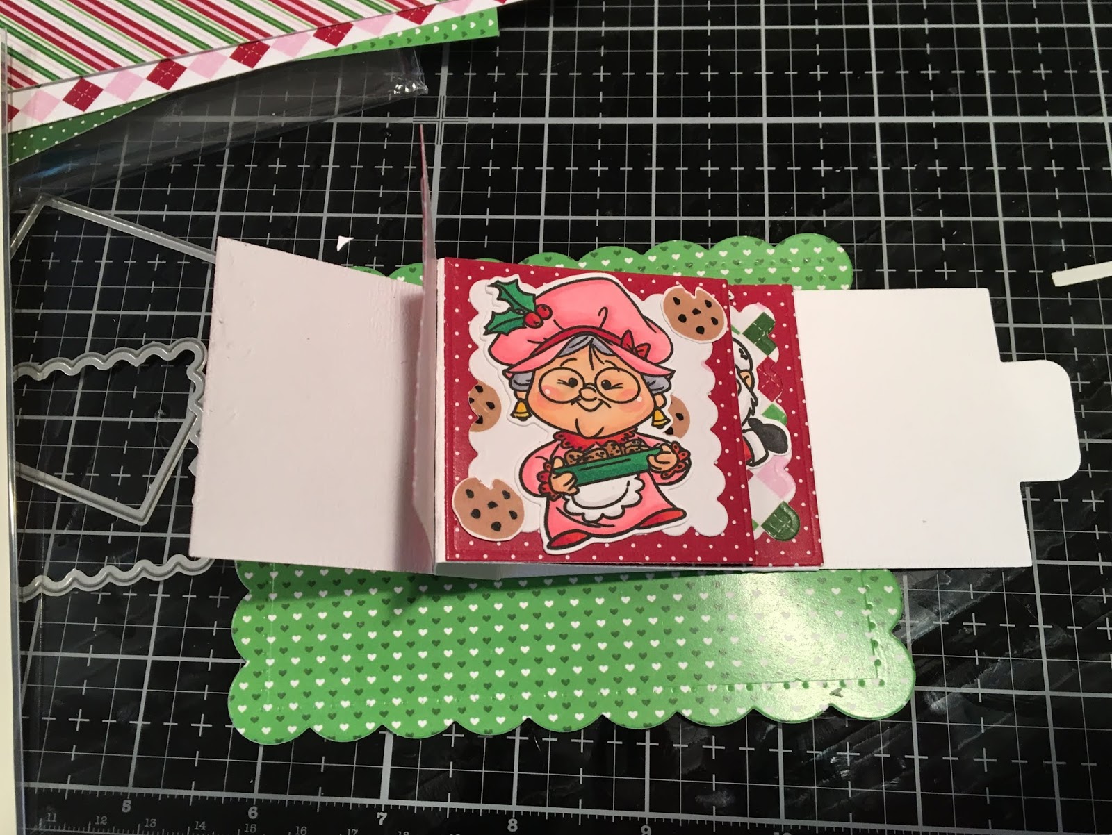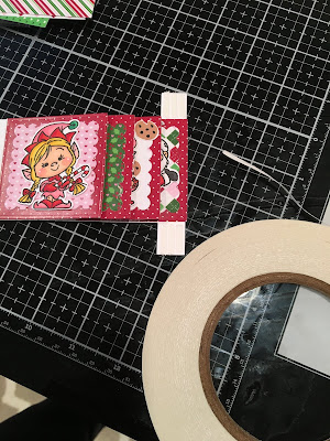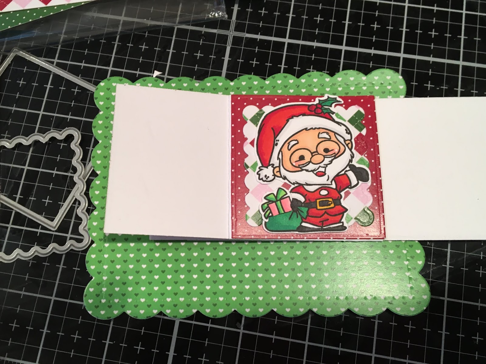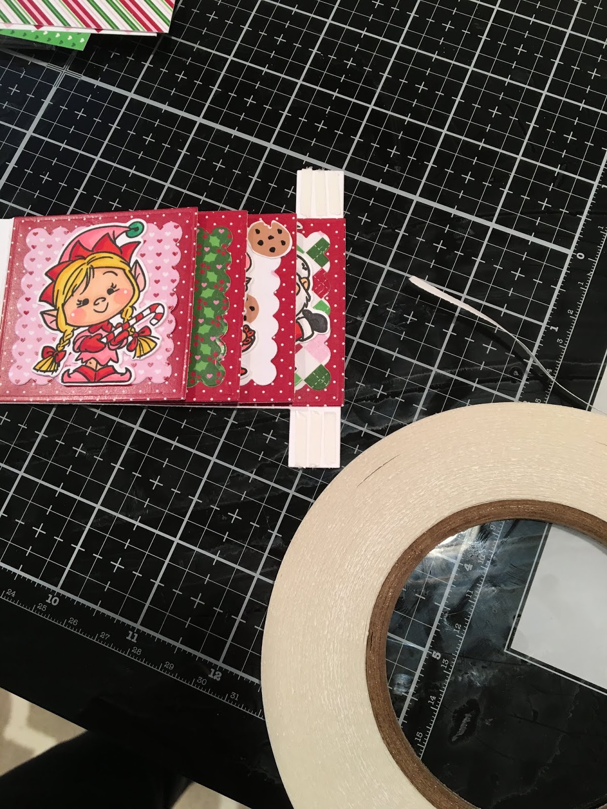 I mounted my characters on the matching patterned papers and lined them up in the order I wanted them to open up with Santa last. That means Santa get glued on first.