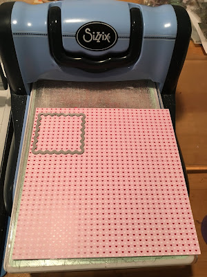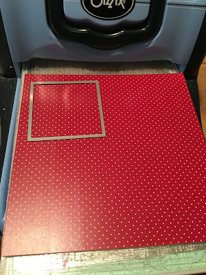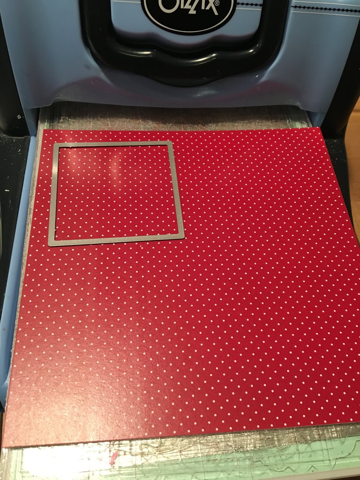 Die cut and decorate your four panels. I used the square panel in the red polka dot paper as my "frame" and the scallop square with all the different patterns in the center.