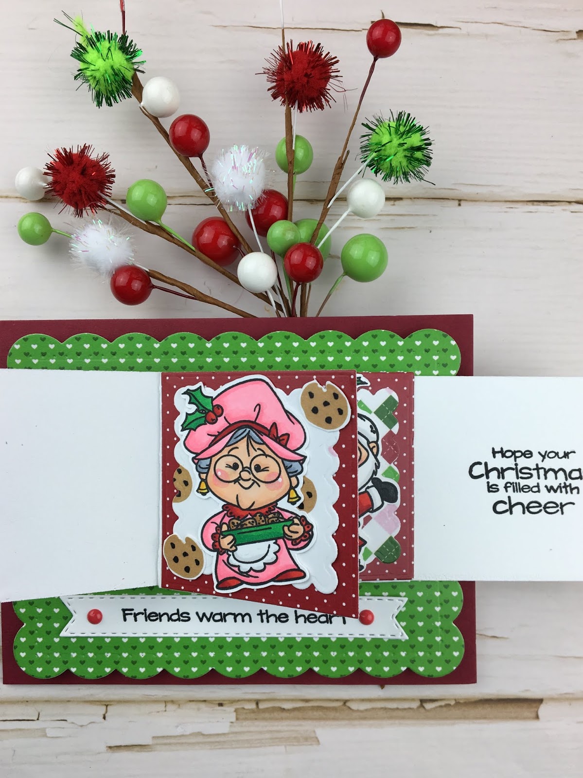 Let's start with the finished card so you can see where we are headed. I colored all the Tiny Christmas characters with Copic markers using the Christmas Paper Pad as my color guide.