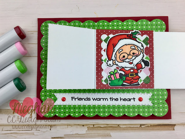 I stamped a sentiment next to Santa so that as the recipient pulls it out they reveal Santa and his greeting! Then I mounted the whole thing with 1/4 in thick foam tape on to my card base. This makes it easier to use the flip. I finished my card with a sentiment below the flip book using the NEW Tiny Winter set and C.C Designs Christmas Enamel Dots.