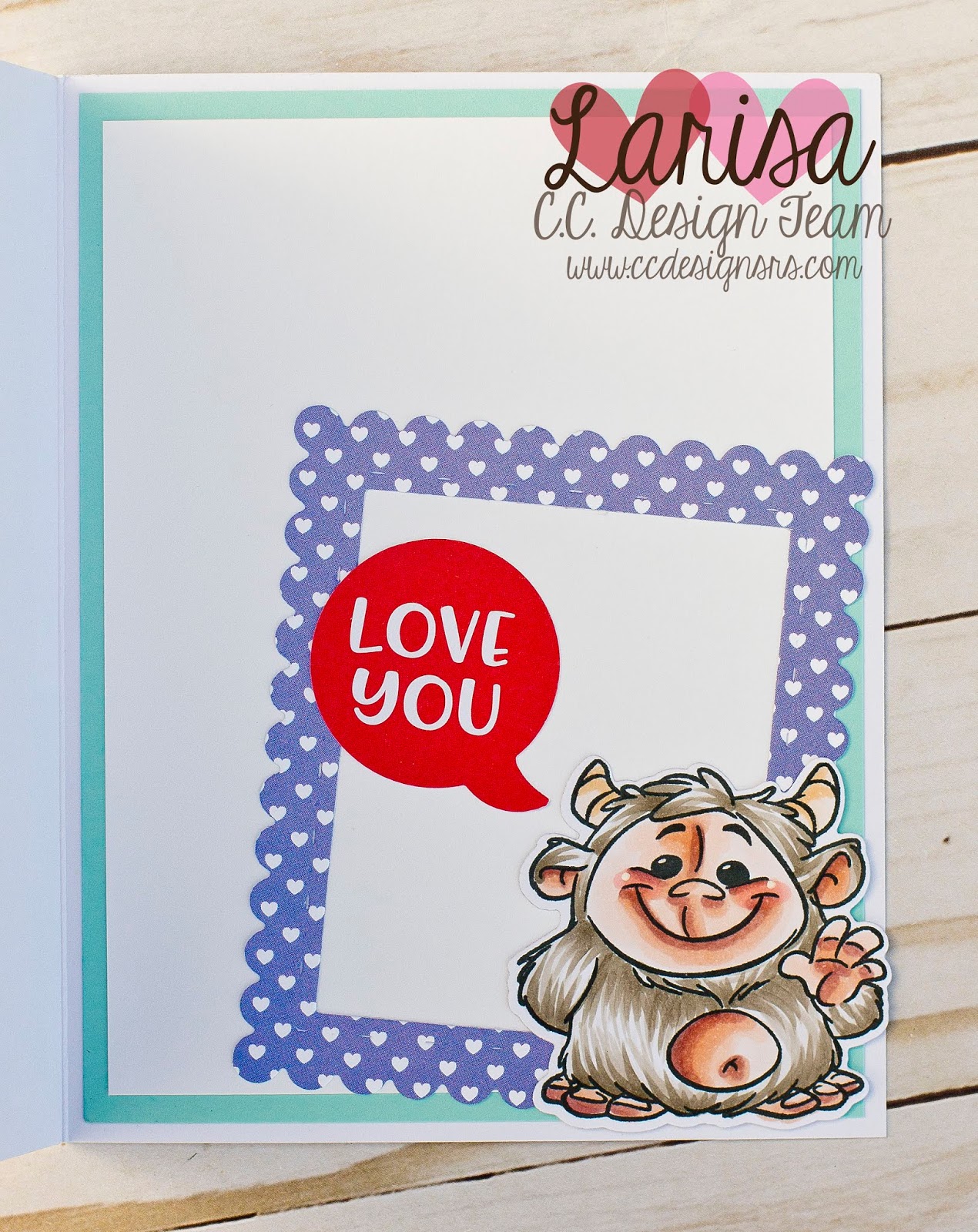 Hello! Larisa here. Valentine's Day is just around the corner and I have the cutest Valentine card to share with you using the NEW Abominable Clear Stamp Set from CC Designs! To create my card, I started with some patterned papers. Then I die cut a white In & Out Rectangle frame. I layered on a scalloped hear and popped my little yeti on top using some foam tape. I added a few die cut hearts, some enamel dots, and there you have it. One abominable valentine!