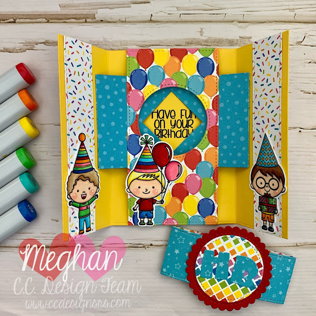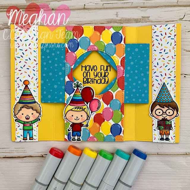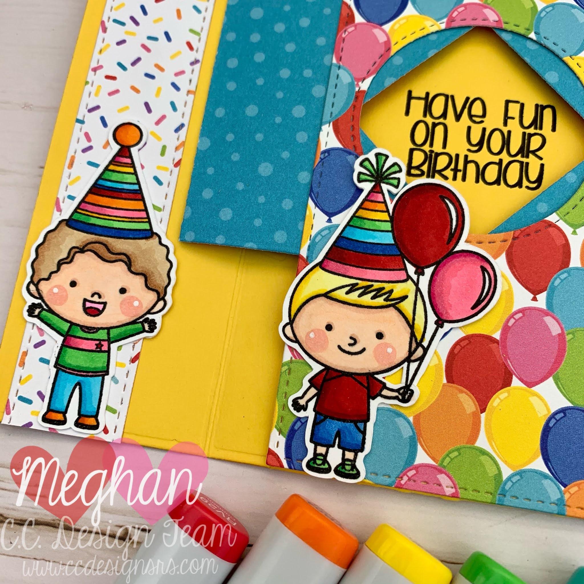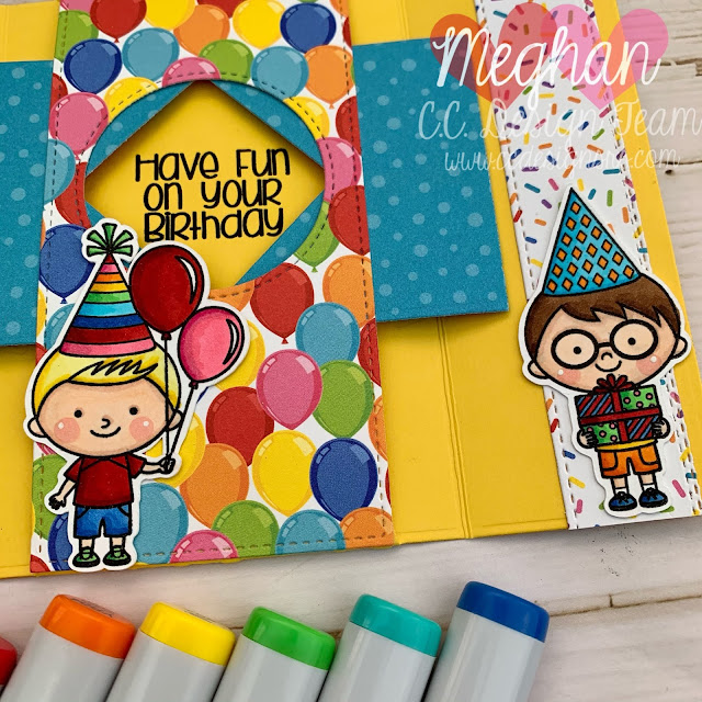 Have you been stocking your stash of Birthday Cards for the year? C.C Designs Birthday Release is perfect for all your birthday card needs!!! I made a fun shutter card using the NEW C.C Designs Birthday Kids and the NEW Birthday Sentiments Stamps revealed inside. I had so much fun coloring these kiddos in all the colors of the rainbow.