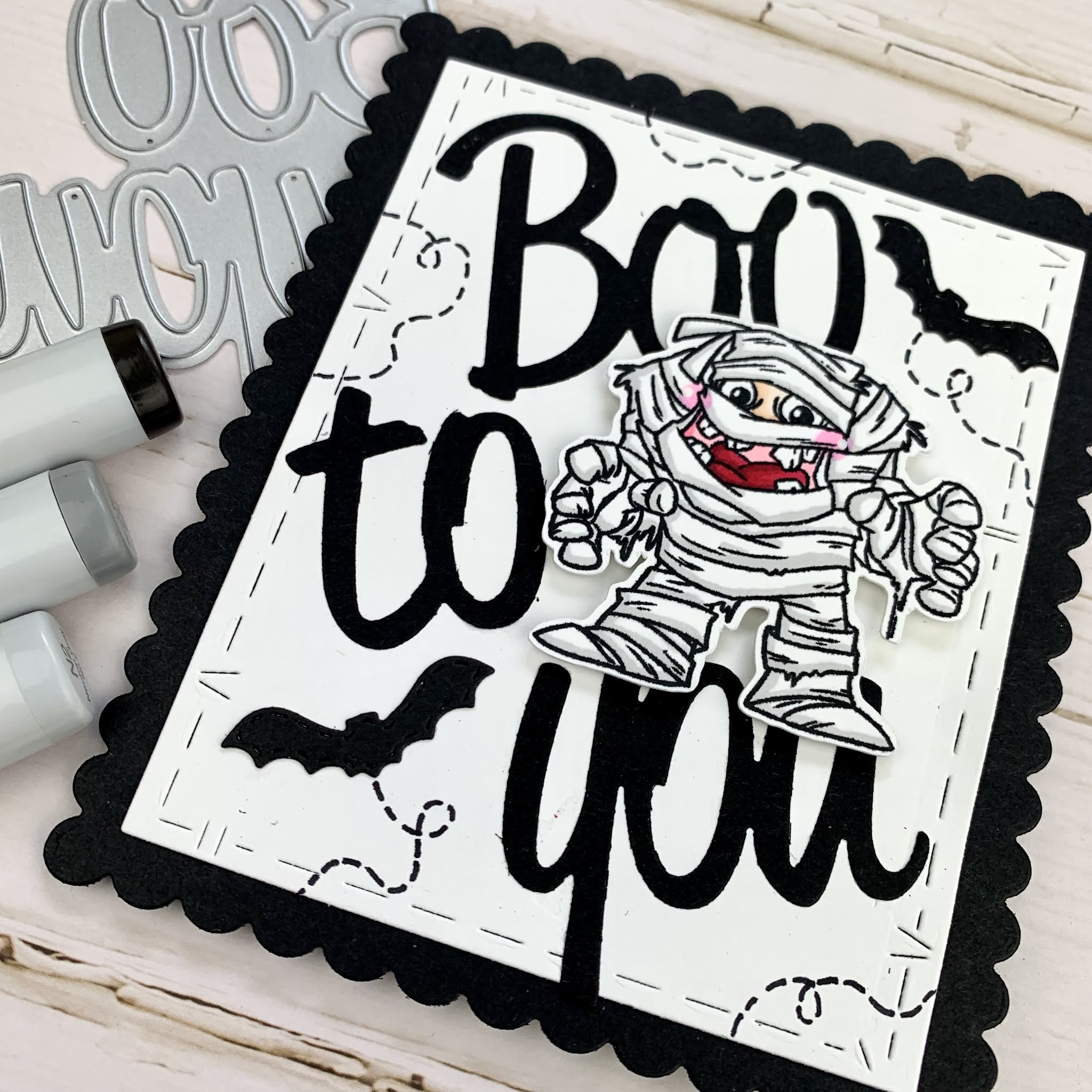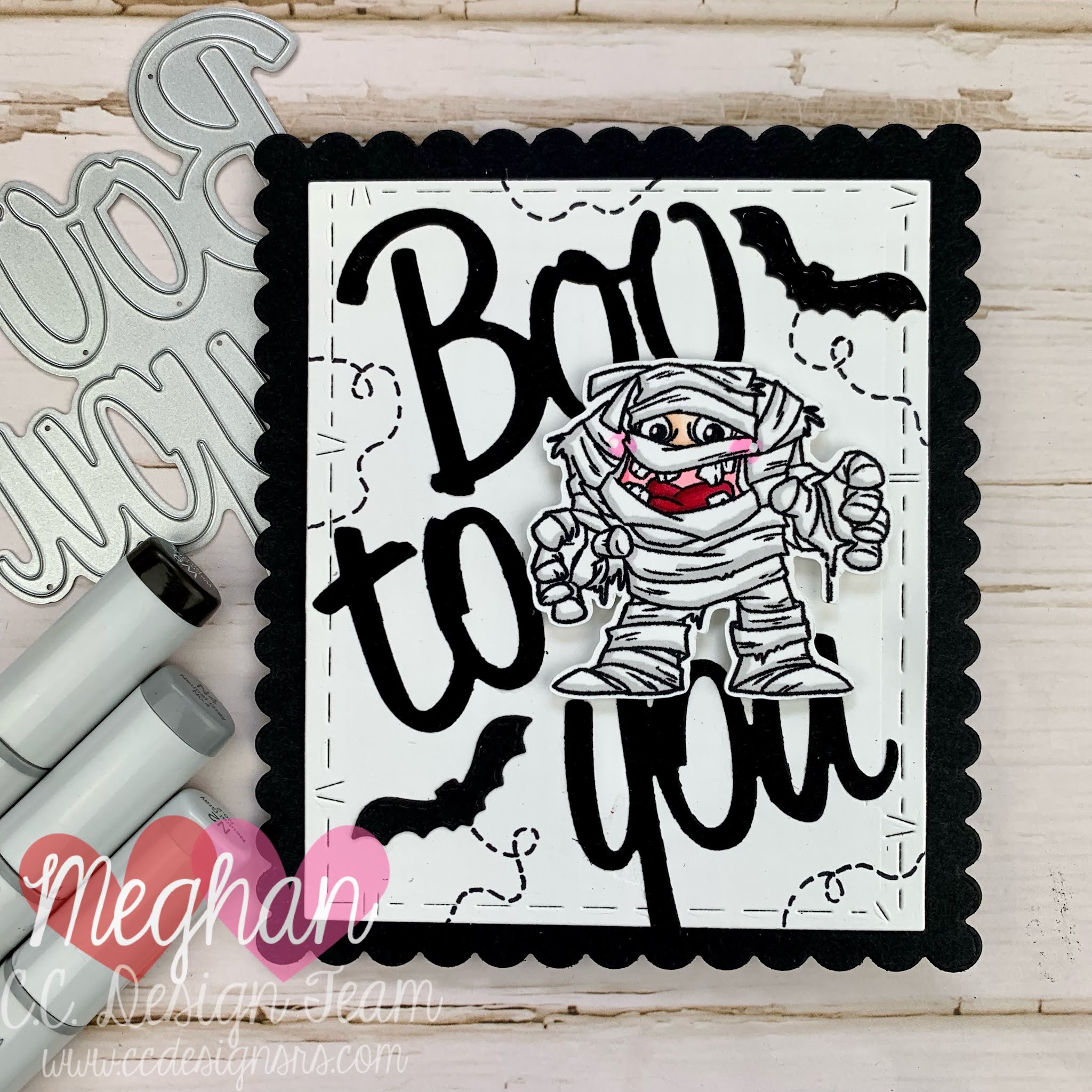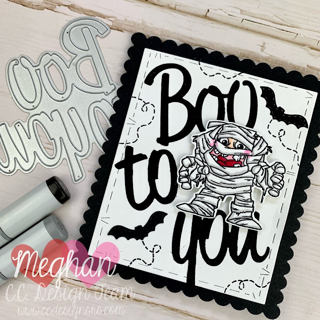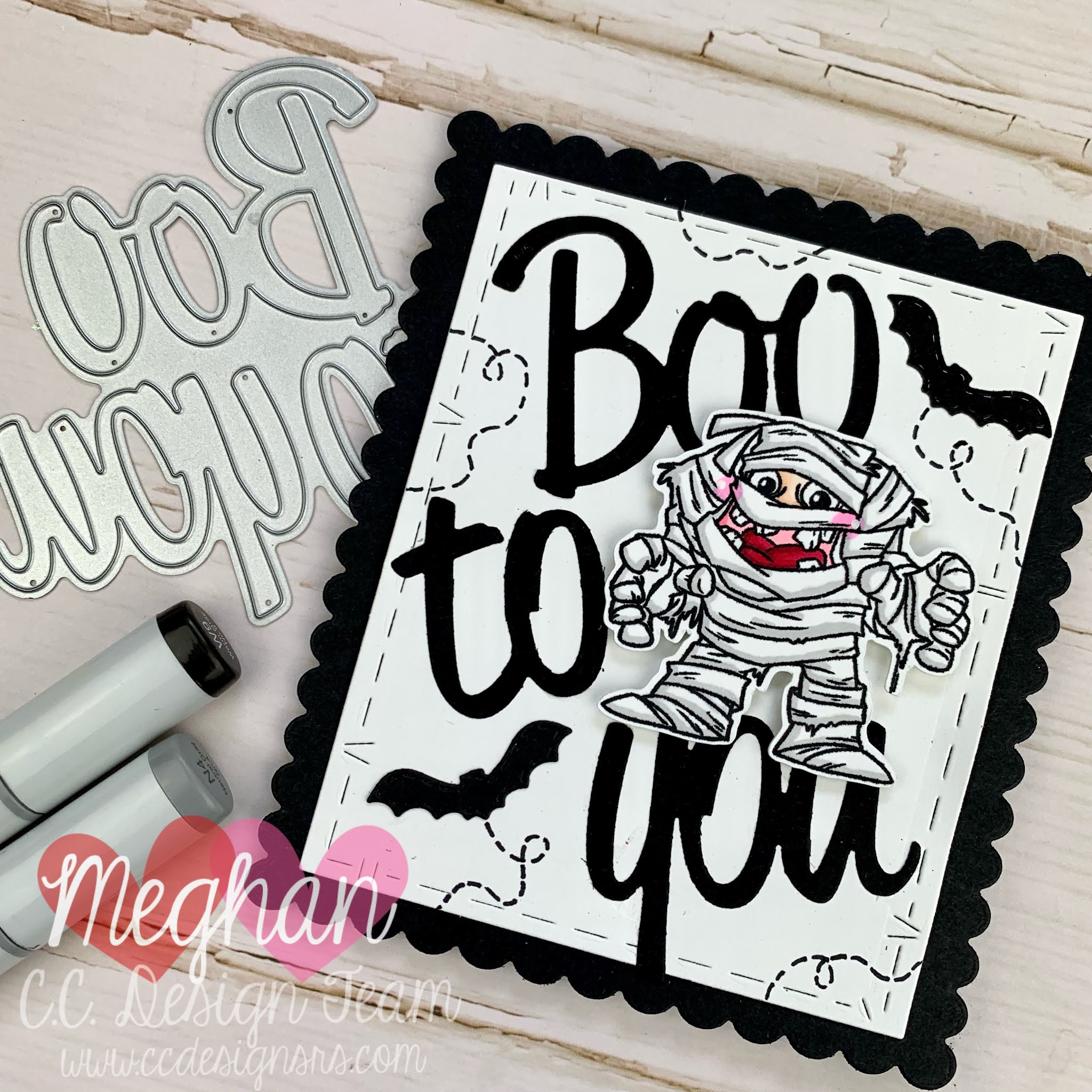 Have you seen the Halloween CUTENESS in the C.C Designs September Release? I love the Halloween Monsters Stamp set! This set comes with 3 cute little monsters. I'm sharing a FUN Mummy card using the NEW C.C Designs Boo to You die as a background.
