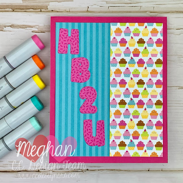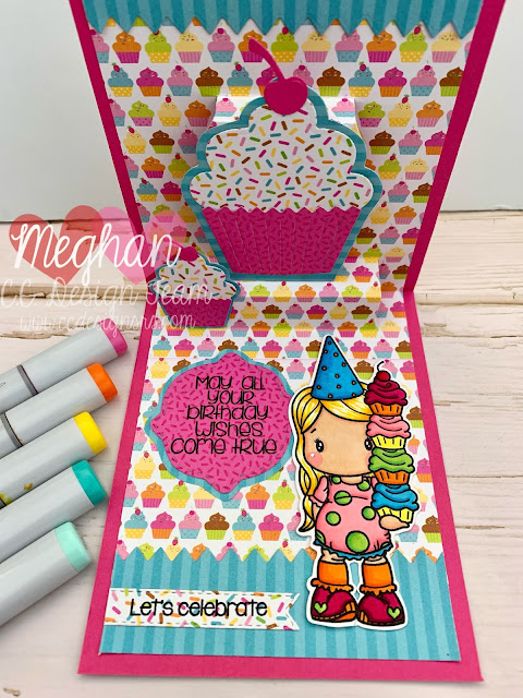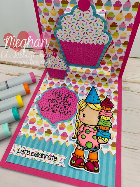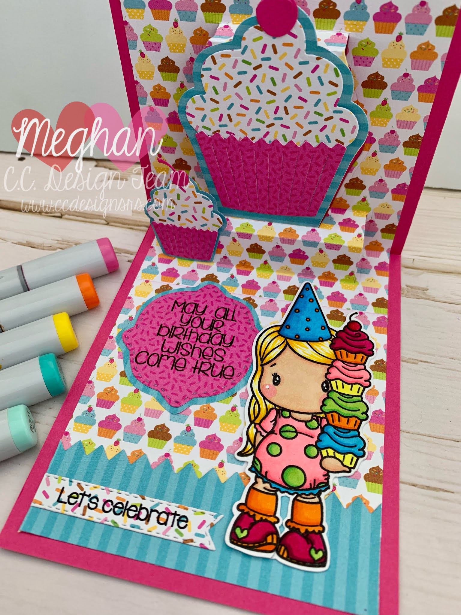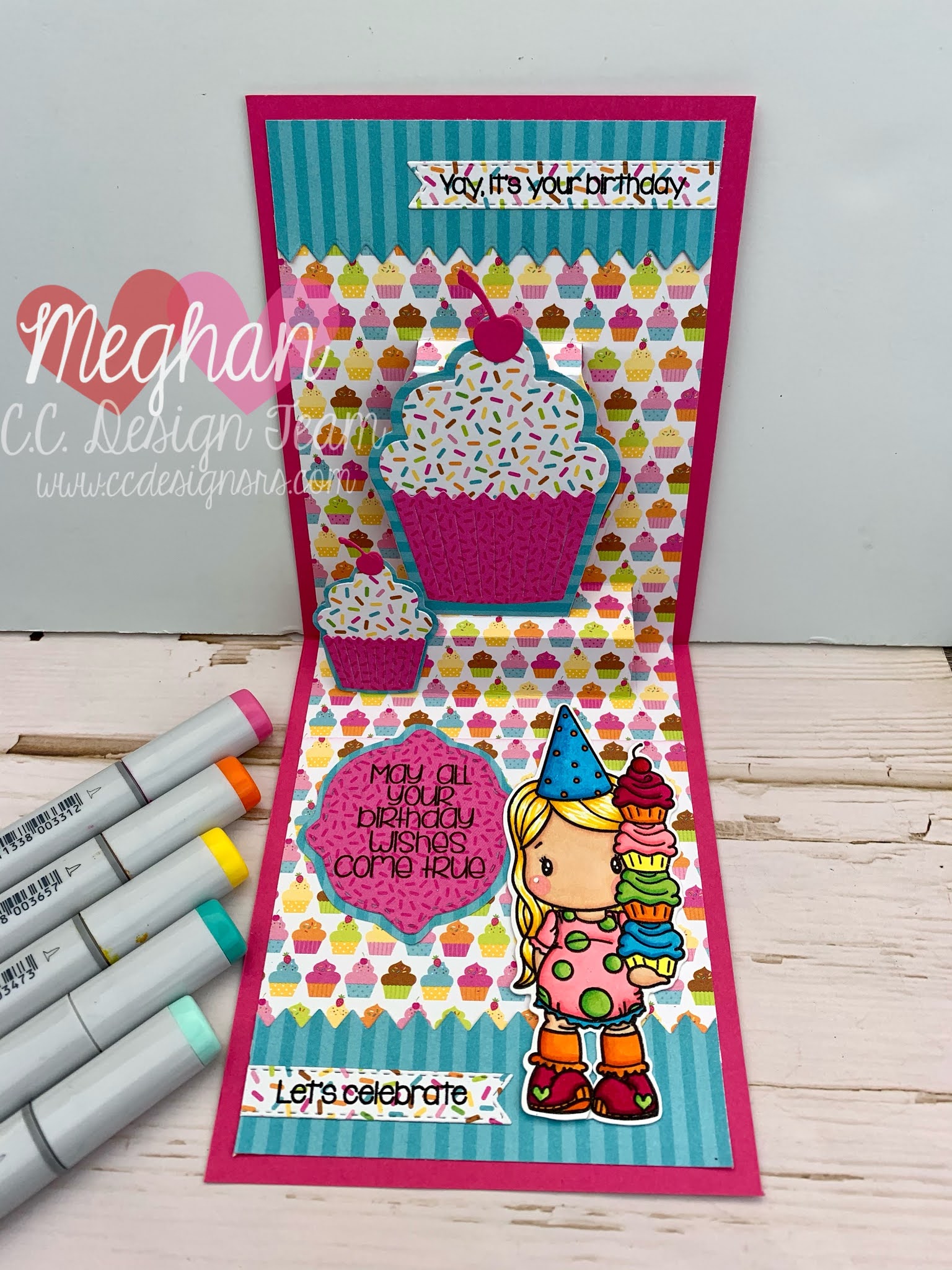The C.C Designs Birthday Release is HERE!!! Today, I am showing off the Birthday Swissies set. I made an interactive card using Karen Burniston Cupcake Pop Up and used the NEW Birthday Sentiments Stamps inside stamped on the C.C Designs Deco Square Die . Time for a Cupcake Party!