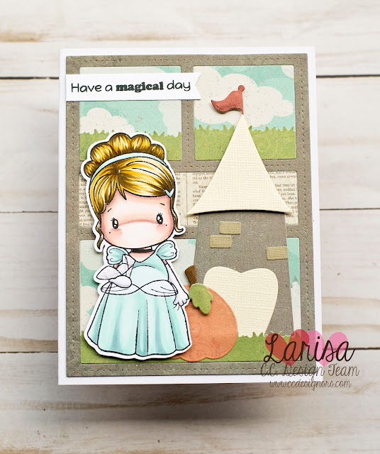 Hello! Larisa here and today, I have a sweet little fairytale card for you featuring the NEW Ella Swissie stamp from CC Designs. For my card, I used the Quad Collage die to create my background. I also used the grass from the Cloud and Grass Die set to create my grassy hills. Once I had my background created using patterned paper, I moved on to my little castle tower and added a little pumpkin in front of it. Then I popped my image in front with some foam tape and added my sentiment to the top. Such a sweet little fairytale card!