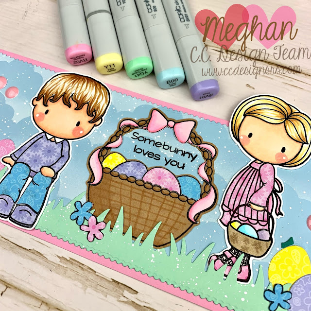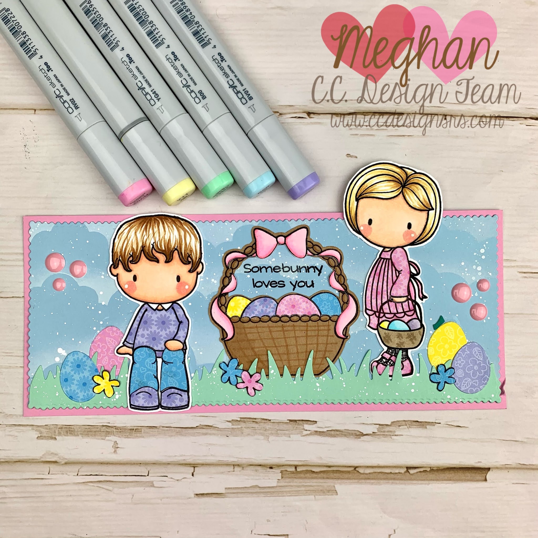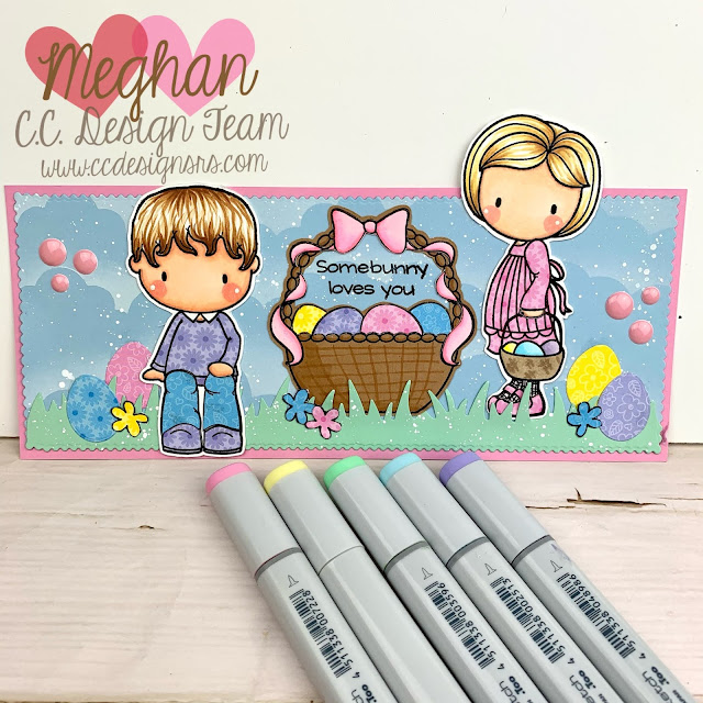 I have a Easter Slimline card to share with you today to inspire you to join the C.C Designs Facebook Challenge! This month's theme is Spring/Easter. Join the Facebook Group and put your creation in the album for your chance to win a $15 gift card to the store. I used the Easter Sugars stamp set and Scalloped Slimline Metal Die for this card and paper pieced their outfits and the eggs using bright colorful spring papers.