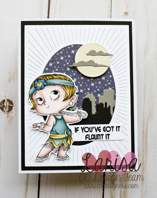 Hello, Larisa here and today I'm featuring this adorable flapper from the 20's Gals Clear Stamp Set from CC Designs. To create this card, I started with some starry paper and trimmed it to fit my card base. Then I used a few dies from my stash to create a city scene and full moon. I colored up my image using Copic Markers and popped her on my card using foam tape. Then I stamped out my sentiment and added that to finish the card off.