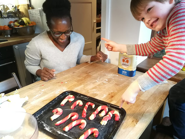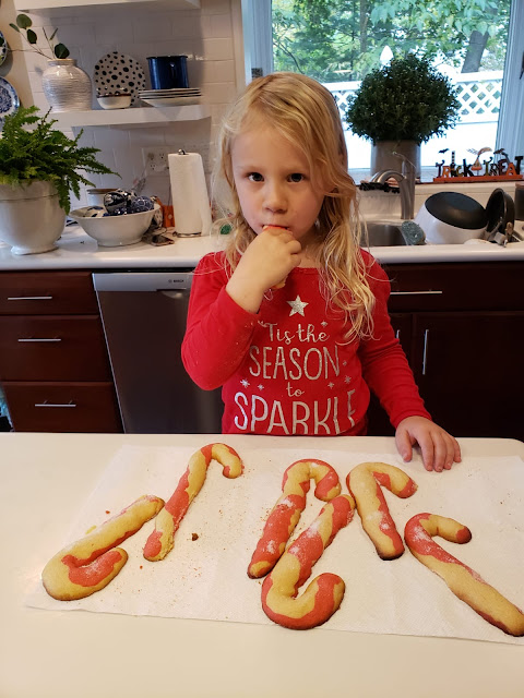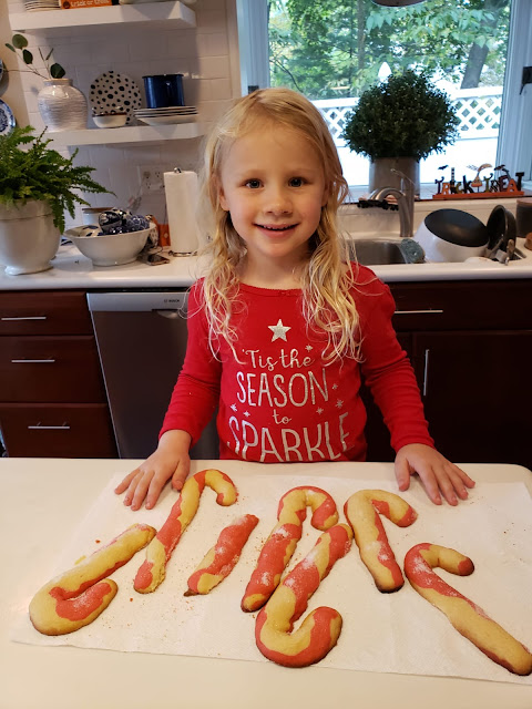 It's almost time to make Christmas cookies and Mrs. Claus Swissie from C.C Designs can't wait! She is baking up some rainbow sugar cookies and sweets for the elves and her hubbie to fuel them for the month ahead! Our family favorite is Candy Cane shaped sugar cookies. My nephew, William who lives in Ireland LOVES baking Christmas cookies, see him below making candy cane cookies. While my niece, Annie in Pennsylvania decided to get started a few weeks ago with her candy cane creations.