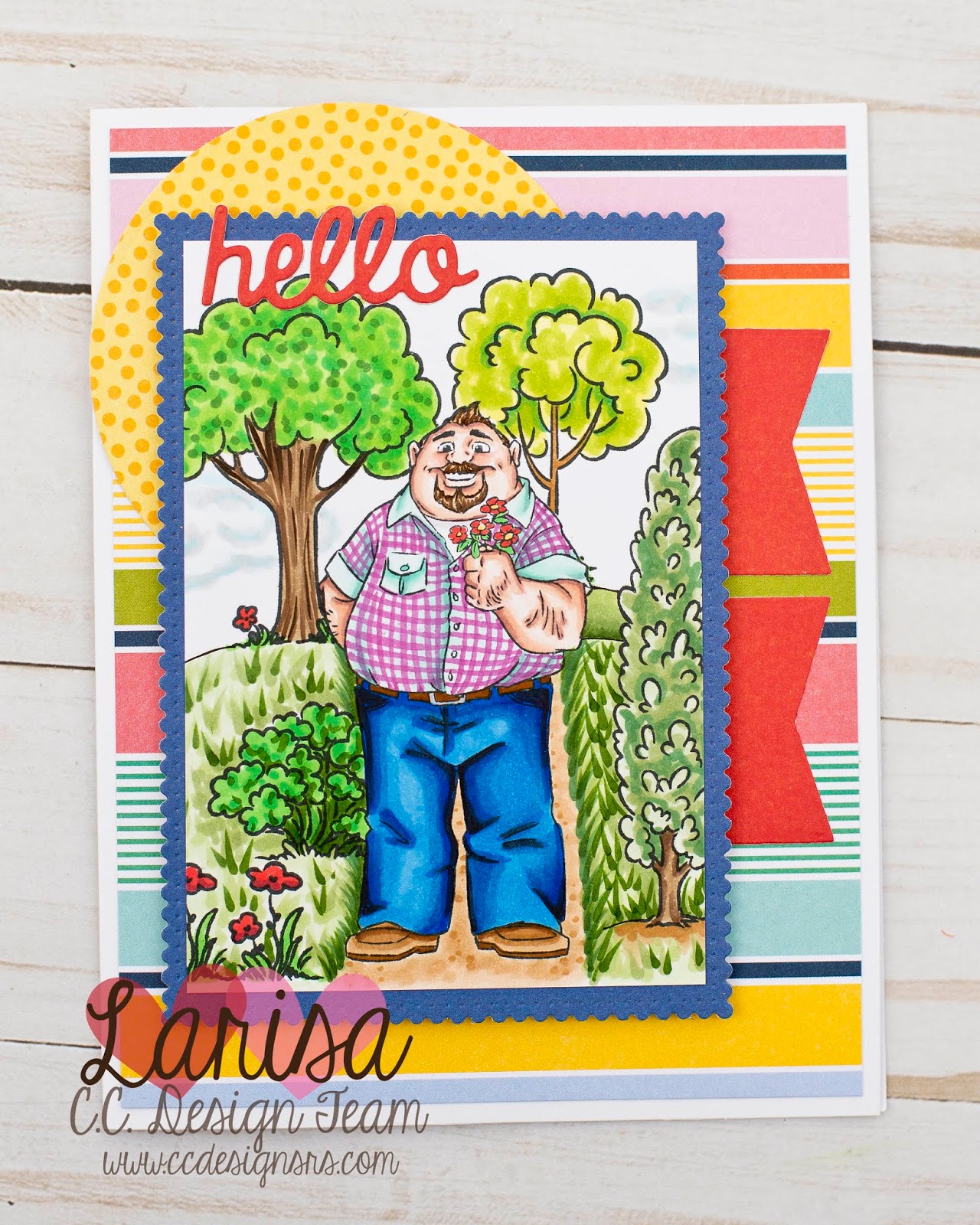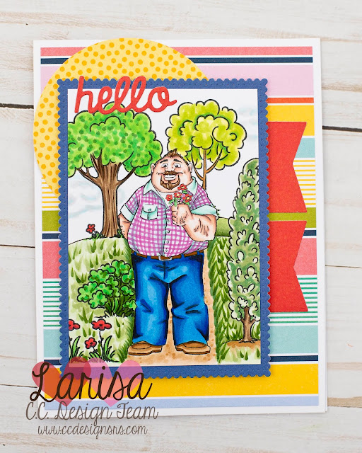Hello! Larisa here and today, I'm sharing a fun and very bright card using the New Oscar stamp. Isn't he just the cutest? For my card, I first created a scene using the NEW Create A Scene Clear Stamp Set. The set is so awesome and allows you to create a different scene with every card! I stamped out Oscar, then covered him with masking paper, and stamped my trees, shrubs, and flowers. Then I colored the whole piece using Copic markers. To create my card, I mounted my scene on a die cut scalloped rectangle, added it to some brightly colored patterned paper, and added a couple of red banners from the NEW Large Banners Die Set.