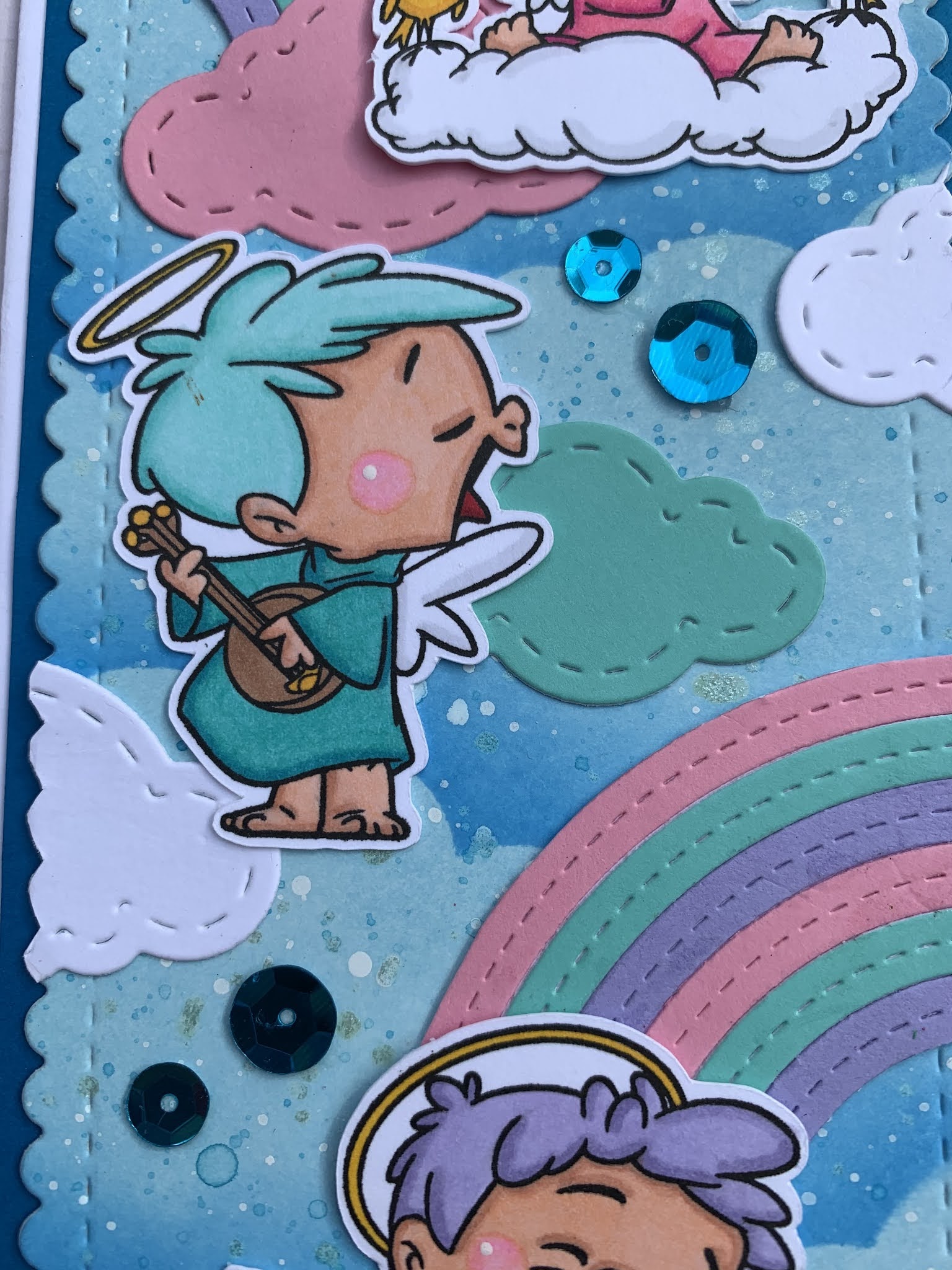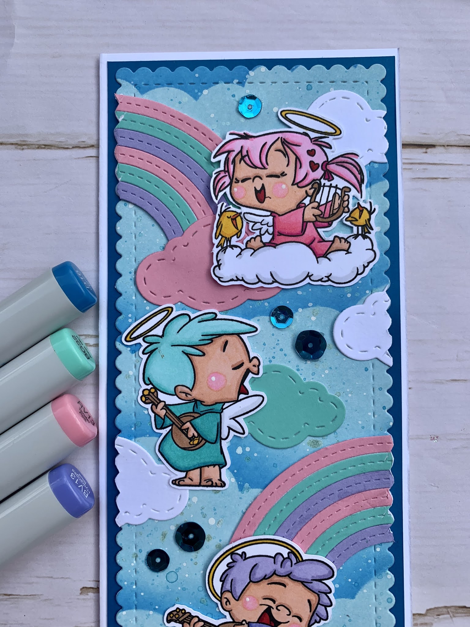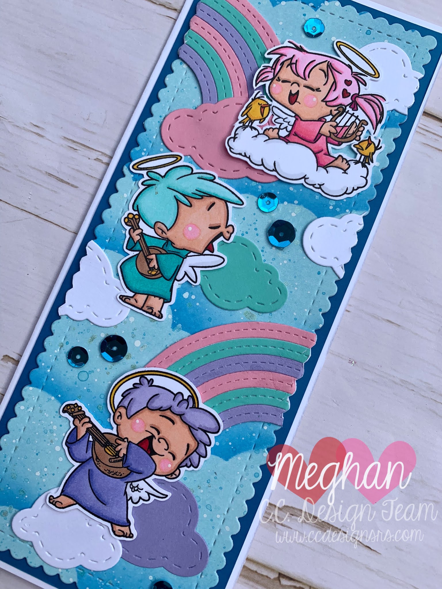 I wanted to show you how to use the C.C Designs NEW Angels in a card that is NOT for Christmas. I colored them up in pink, purple, and teal and made a pastel cloud and rainbow background for them to play.