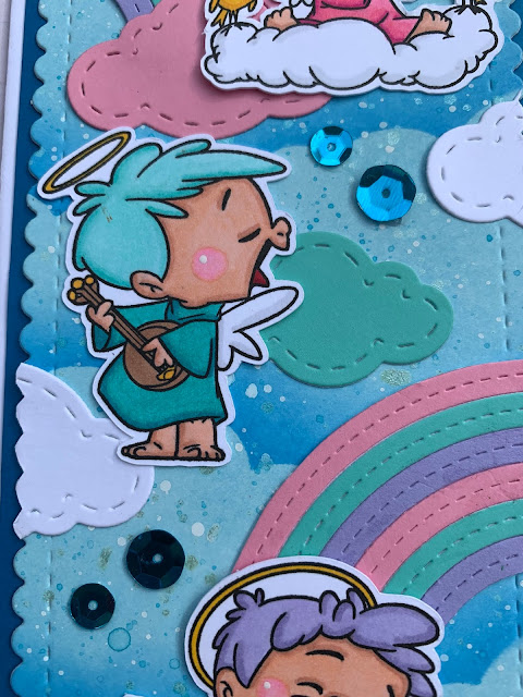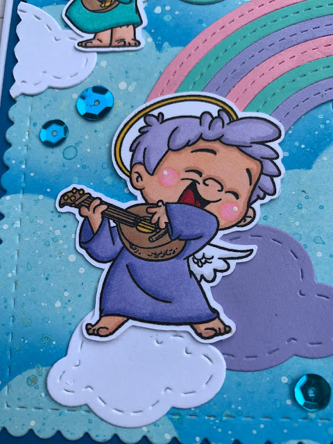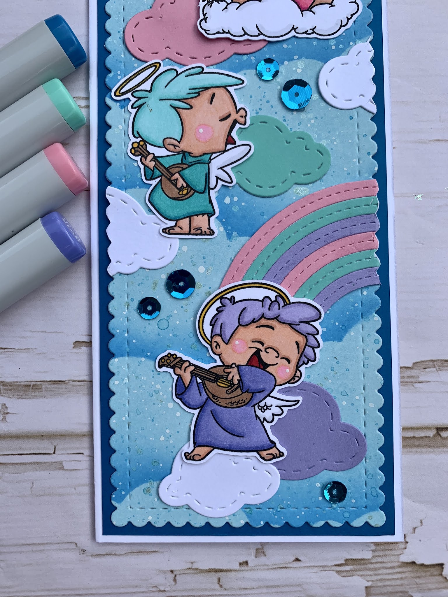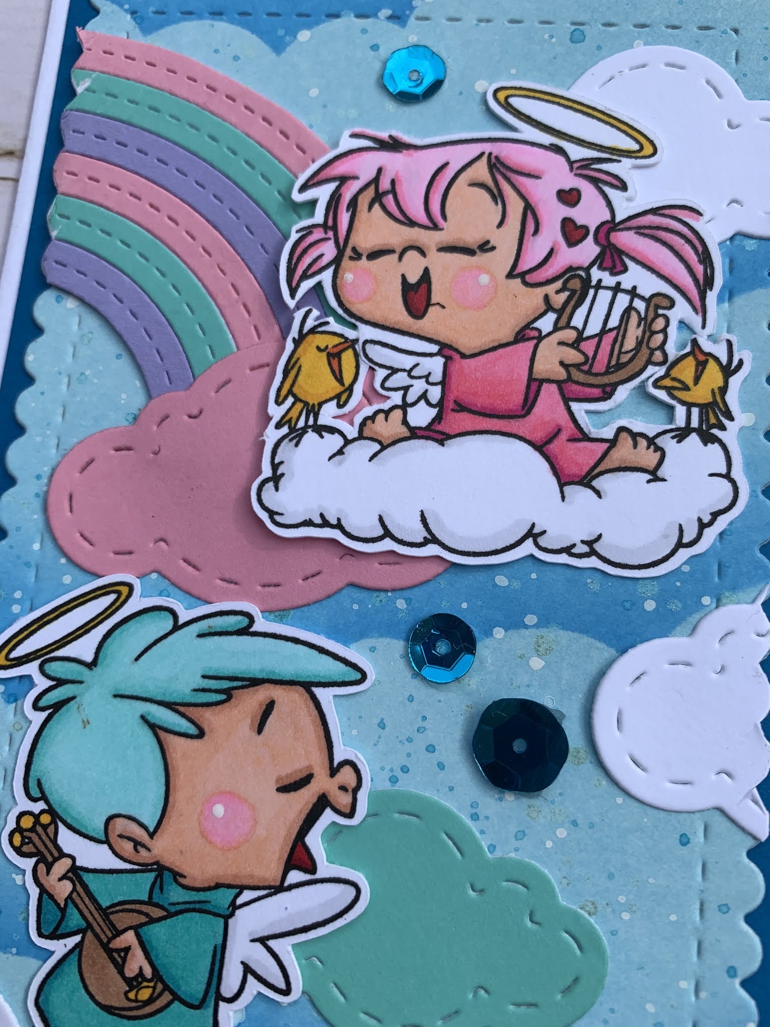 I wanted to show you how to use the C.C Designs NEW Angels in a card that is NOT for Christmas. I colored them up in pink, purple, and teal and made a pastel cloud and rainbow background for them to play.