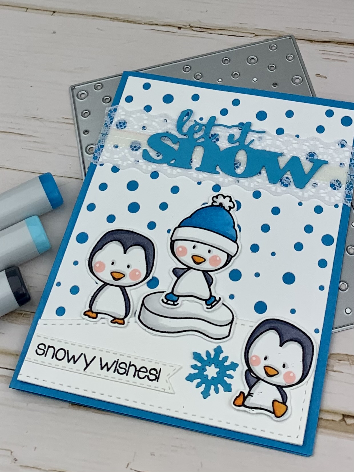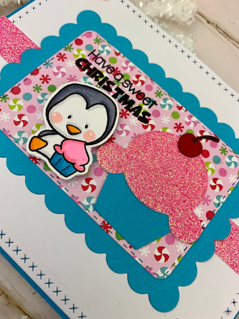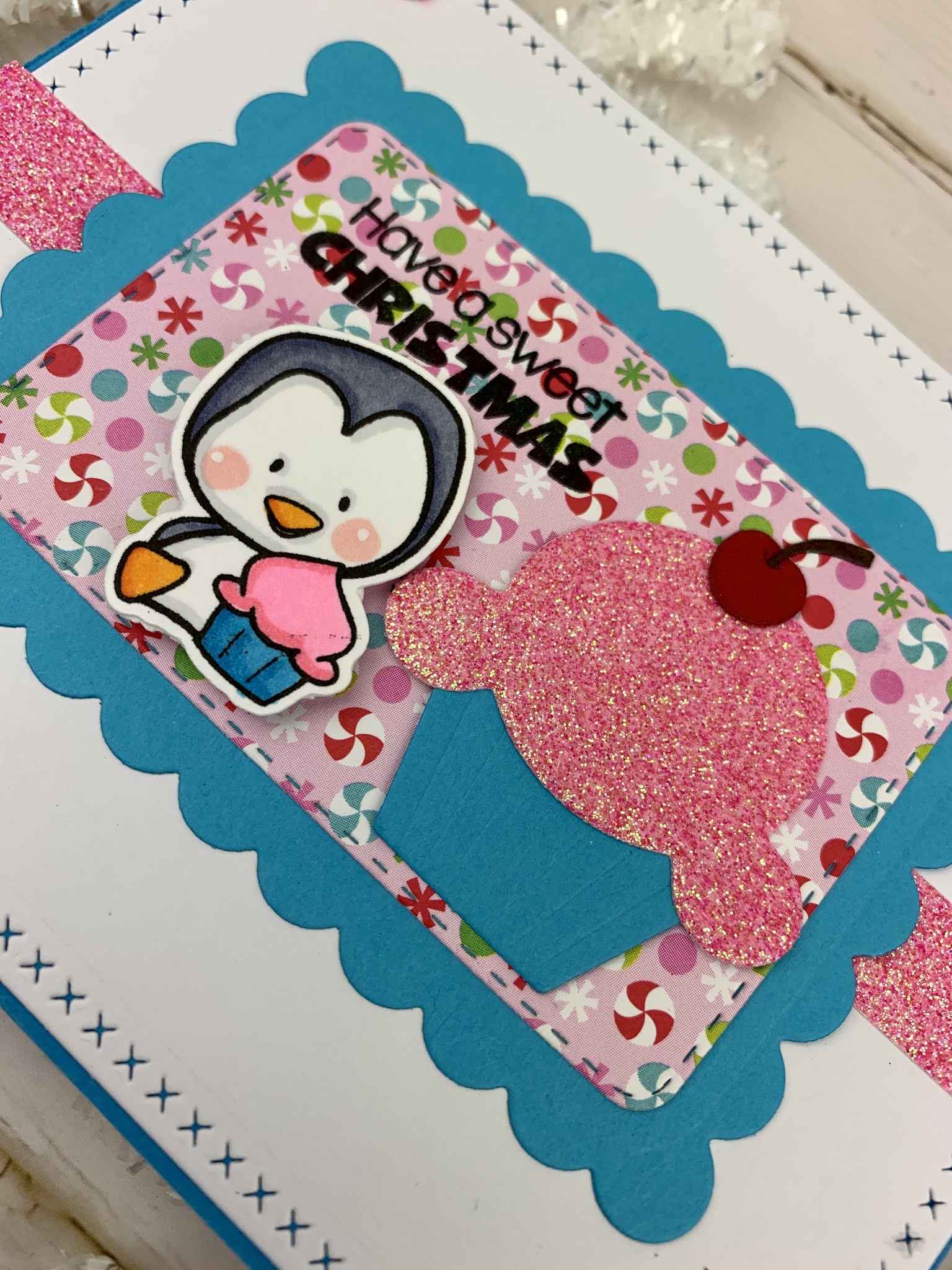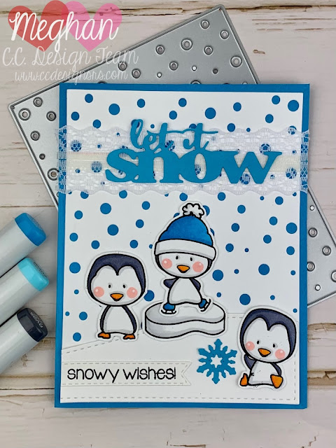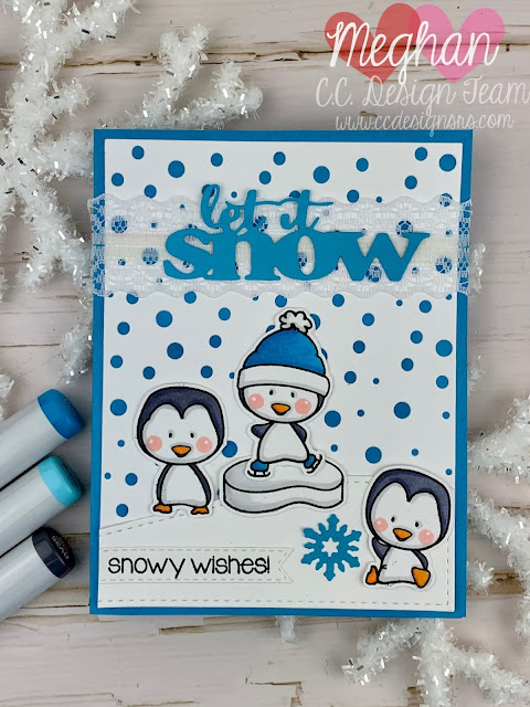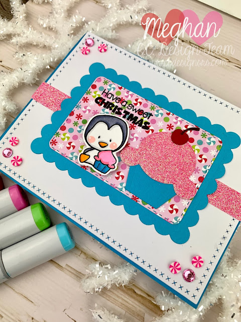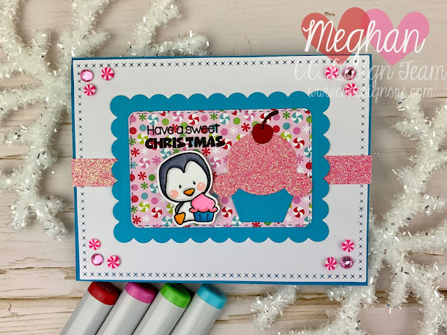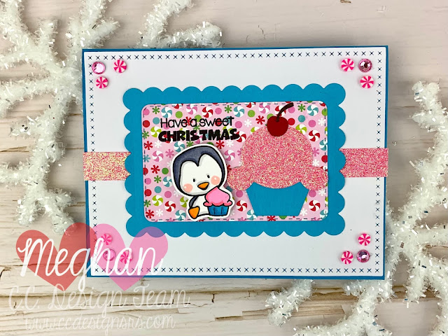 Have you seen the C.C Designs December Release? I love these darling penguins!!! I have two penguin cards for you today featuring the C.C Designs Penguins Stamp Set. The first cutie is enjoying all the Christmas treats with his little cupcake. I framed him with candy sprinkles and Christmas Candy Pattern Paper ;). The second trio is hoping for a white Christmas so they can play in the snow, I used the C.C Designs Spotty Dotty Background Die for their scene.