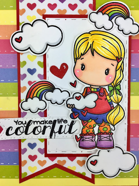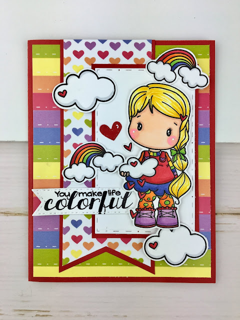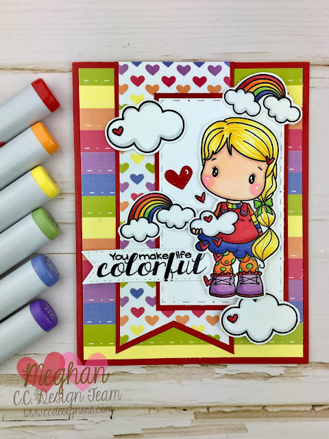 I am in LOVE with this Swiss Pixies stamp set from C.C Designs called Unicorn & Rainbow. I did a post earlier this month featuring the Unicorn Swiss Pixie HERE, so now I am showing off the Rainbow! I was inspired by my little niece Annie, who loves unicorns and rainbows and dresses herself in this colorful outfits just like her Aunt Meghan.