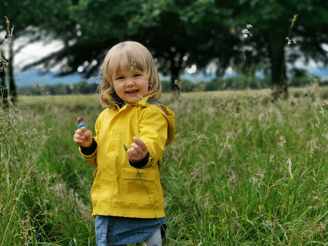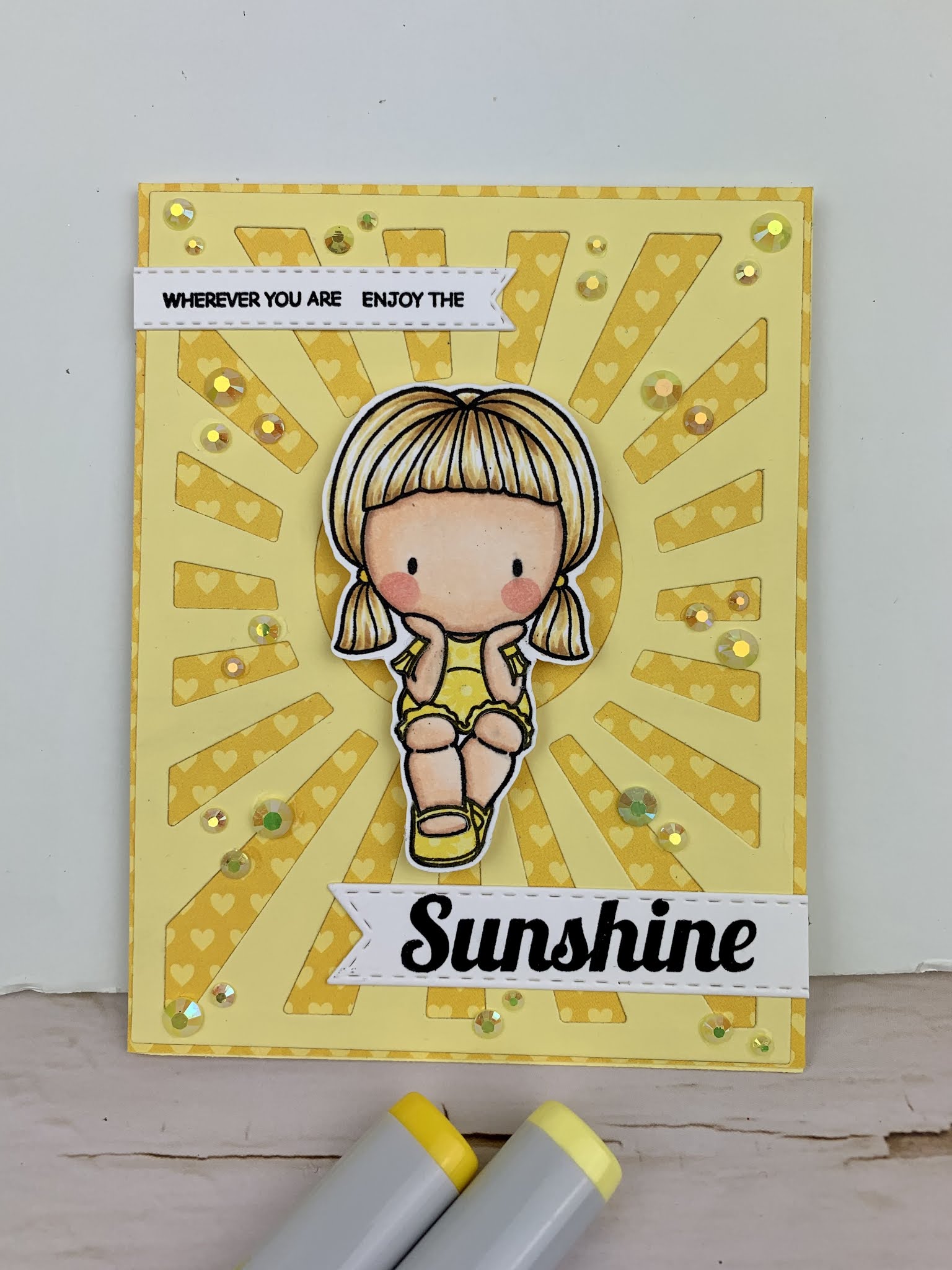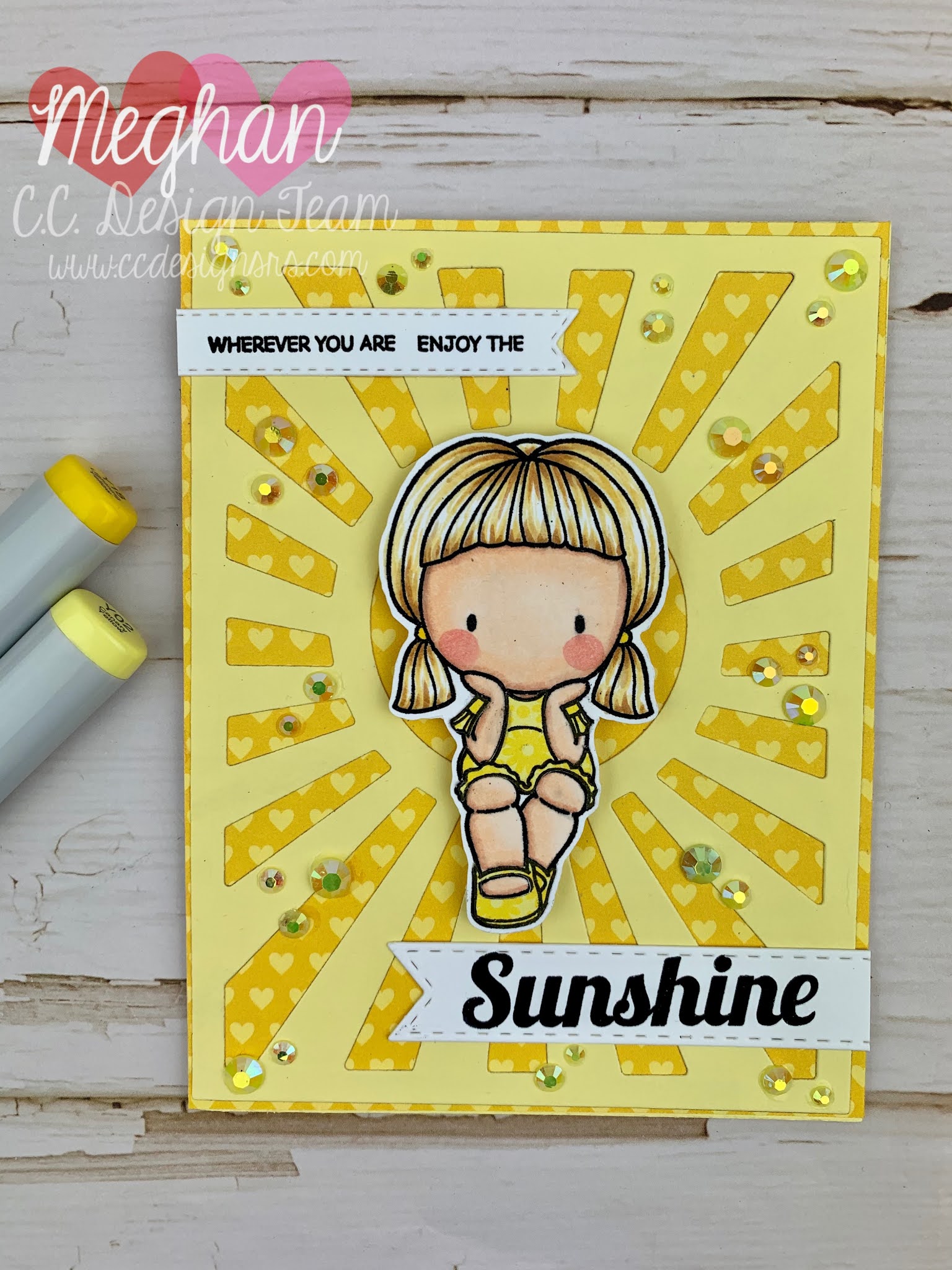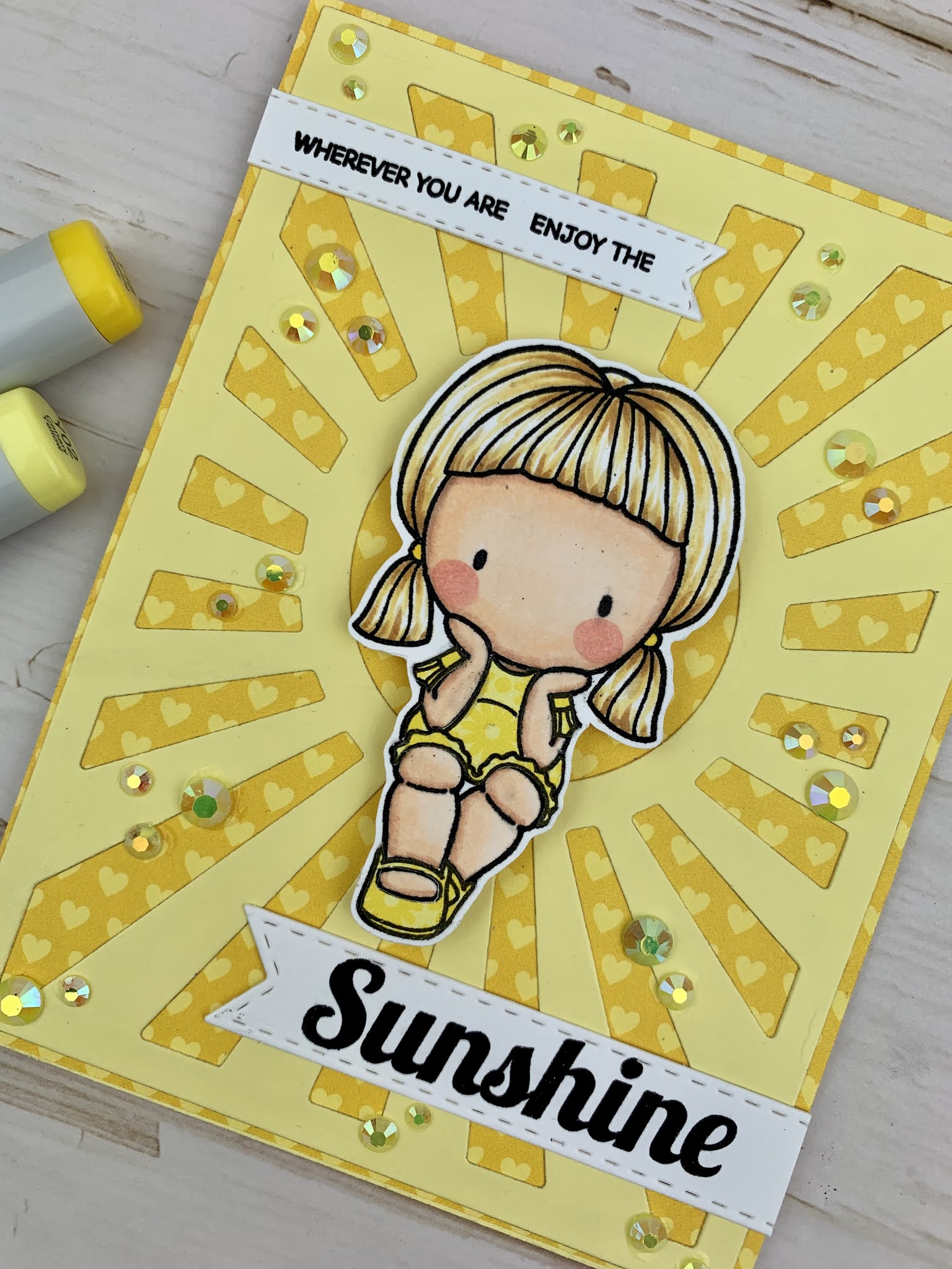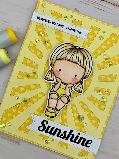 I am sharing a bit of sunshine with you today using the C.C Designs Easter Sugars stamp set. They don't have be for Easter cards! I used paper piecing with yellow pattern paper for her outfit and for my sunshine background. This little lady reminds me of my niece, Polly who loves her yellow raincoat (see below).