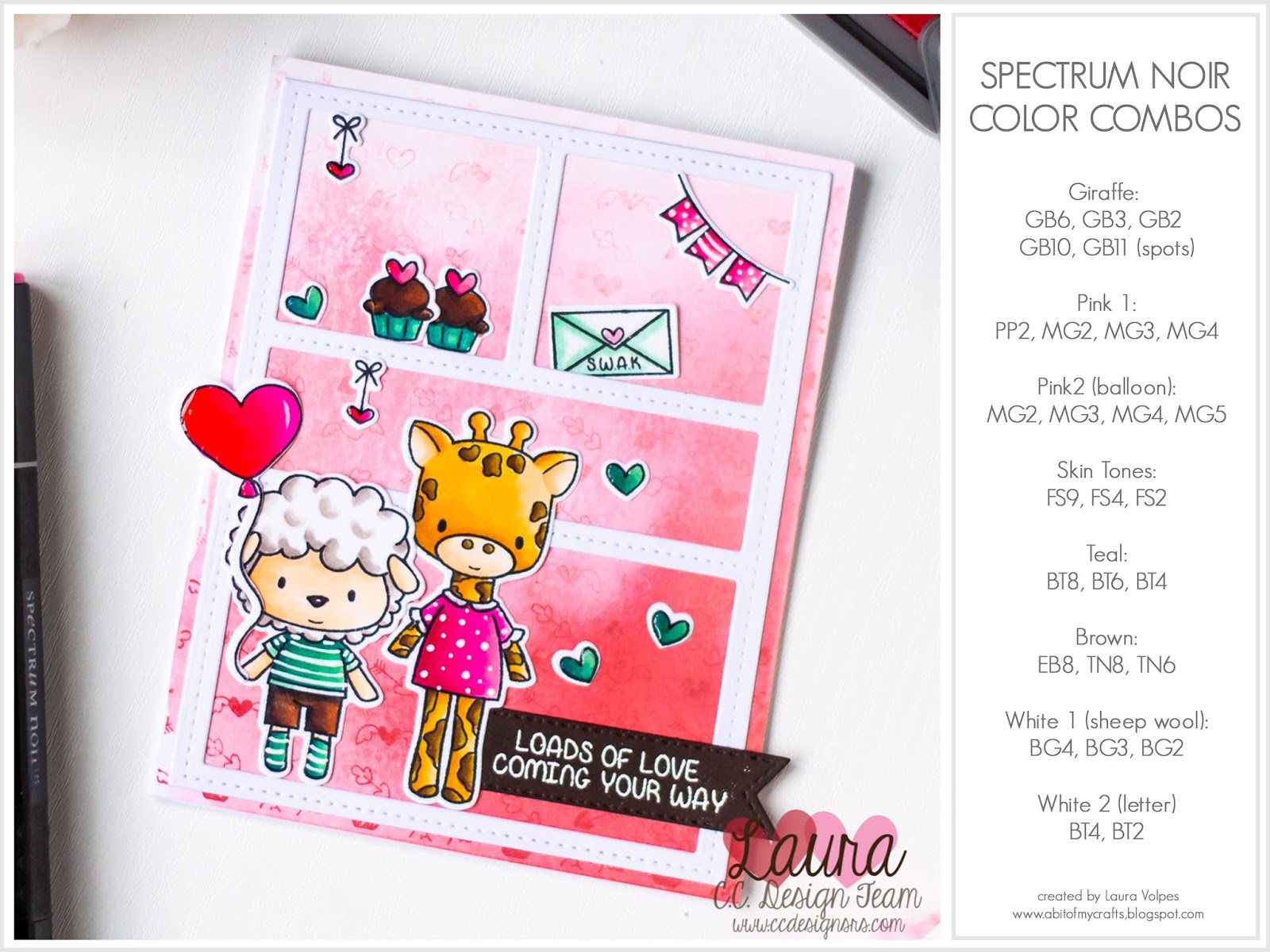 As an additional background element I die cut some white cardstock with the Quad Collage die, and I then moved on to color my images. For today's card I chose the newly released Valentine Animals stamp set. I stamped the images with Memento Tuxedo Black ink on Neenah Solar White 110 lb cardstock and colored them with Spectrum Noir Markers. And here is a color chart for you to use a reference.