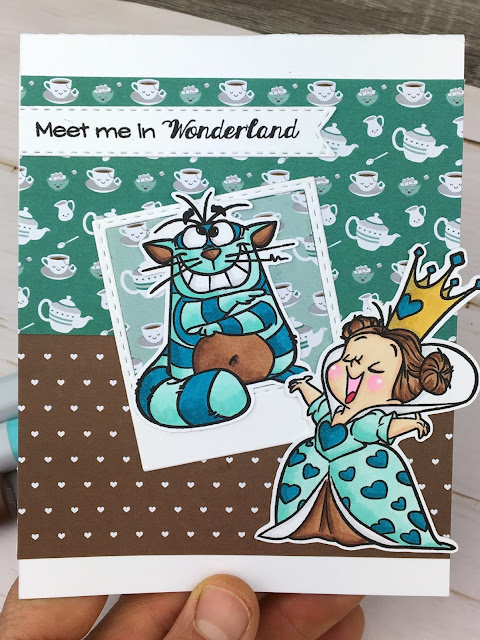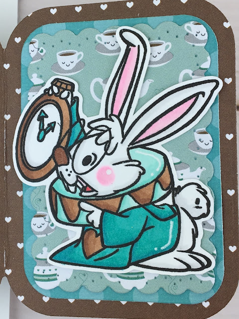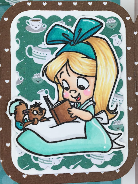 You're INVITED to my Alice in Wonderland Tea Party! I used all the NEW C.C Designs Wonderland and Queen of Hearts Characters in this fun Pop Up Panel card. I colored the characters to match my tea papers rather than the traditional Alice in Wonderland colors. I hope you enjoy my twist of colors on this classic movie.