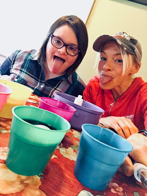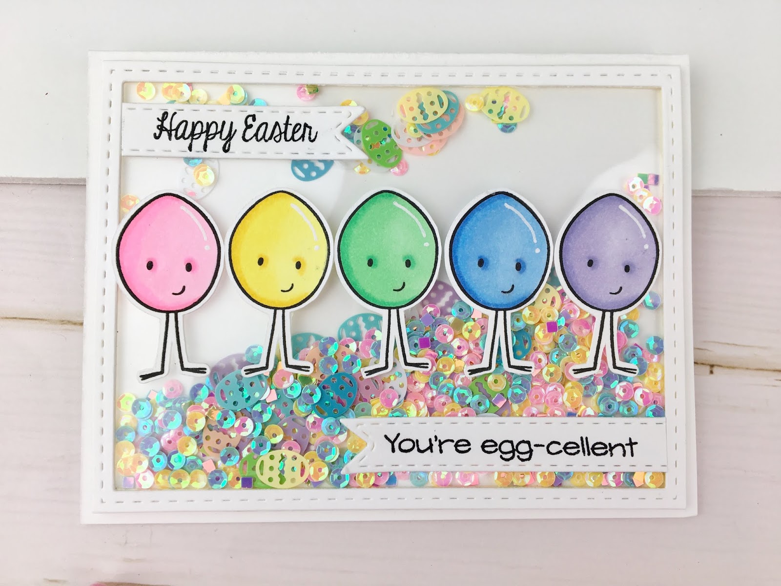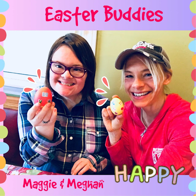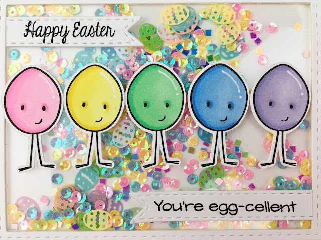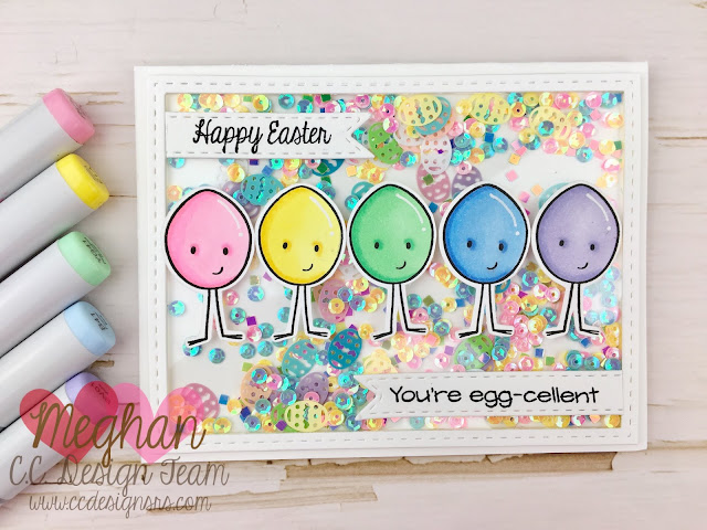 I am sharing a SUPER fun SHAKER with you for Easter! I know it's still a month away but these DARLING EGGS from C.C Designs NEW stamp set February & March are just too fun not to get on a card right away! I colored them up to match my pastel rainbow of sequins and framed them in white so they just pop. I also included some pictures of me and my Best Buddy from Best Buddies International (great group to get involved with), Maggie coloring eggs!
